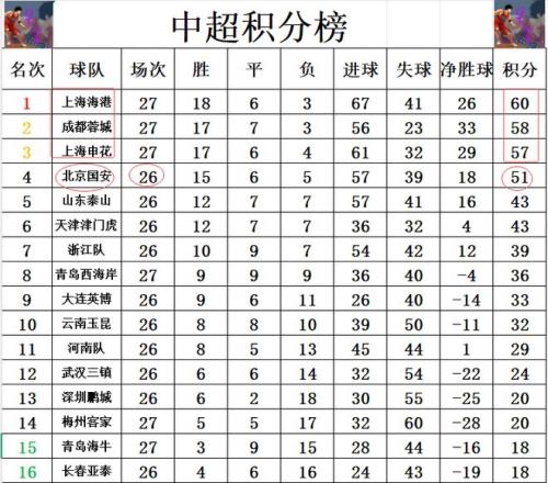 中超最新积分战报北京国安绝望!争冠3强皆赢球上港2分优势领跑