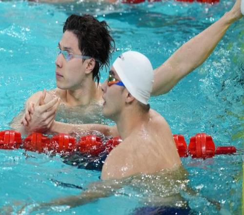 11月12日,上海队选手覃海洋(左)与队友郑英昊在男子50米蛙泳半决赛后握手致意。