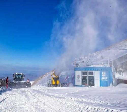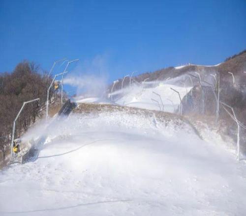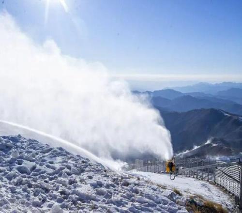 造雪机持续运转,洁白雪花层层覆盖蜿蜒雪道。