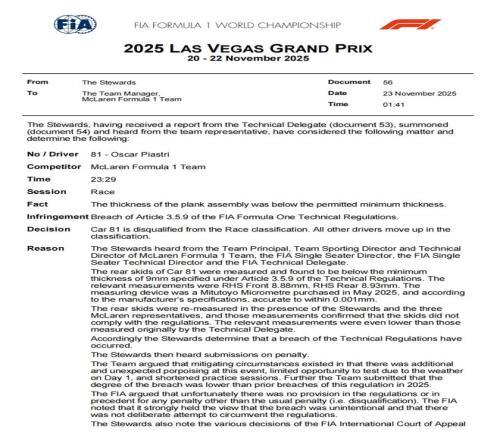 2025赛季F1拉斯维加斯大奖赛正赛刚刚结束,麦克拉伦便遭遇晴天霹雳!国际汽联赛后发布公告称,由于诺里斯和皮亚斯特里的赛车底板磨损测量厚度未达到技术规则要求的最小厚度(9毫米),因此二者均被取消拉斯维加斯站正赛的比赛成绩。