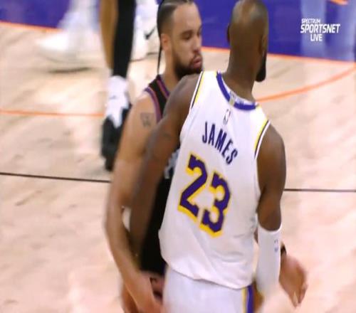 随后狄龙起身后,走向詹姆斯并撞击后者,吃到第二次技规,被裁判驱逐出场。