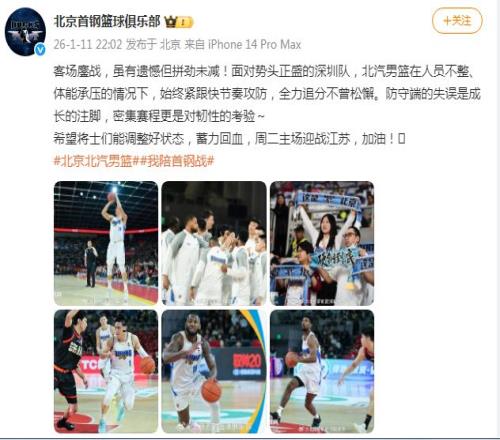 反观北京官微发文总结还是以打气为主:“客场鏖战,虽有遗憾但拼劲未减!面对势头正盛的深圳,北京在人员不整、体能承压的情况下,始终紧跟快节奏攻防,全力追分不曾松懈。防守端的失误是成长的注脚,密集赛程更是对韧性的考验。希望将士们能调整好状态,蓄力回血,周二主场迎战江苏,加油!”