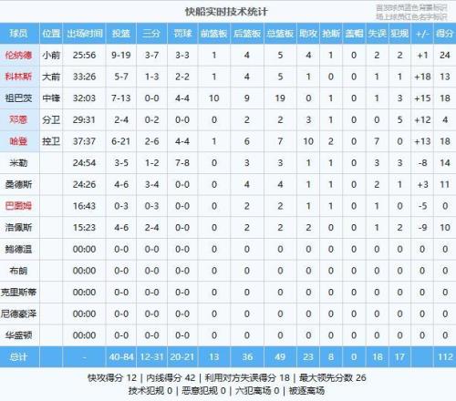 伦纳德24分5板4助、祖巴茨18分19板、哈登18分7板10助2断、米勒14分3板1助、科林斯13分5板1助、桑德斯11分4板1助、洛佩斯10分2板2助、邓恩4分2板3助