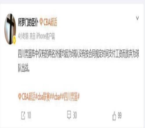 四川队客场不敌南京同曦队,遭遇了本赛季的21连败,他们也是本赛季至今唯一没有胜场的球队。昨天晚上的比赛四川队全华班出战,根据媒体人“所罗门的臣仆”的消息,四川队因为欠薪,两名外援拒绝为球队出战,如果这样的话本赛季四川队可能遭遇42场全败的局面,更严重的是可能会被强制退赛。