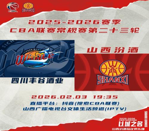 北京时间2026年2月3日19:35,2025-2026赛季CBA联赛常规赛第23轮继续进行,山西汾酒客场挑战四川丰谷酒业,球迷观众可以通过抖音(搜索CBA联赛)、山西广播电视台文体生活频道(IPTV)观看比赛实况,与我们一同为山西汾酒男篮加油助威!
