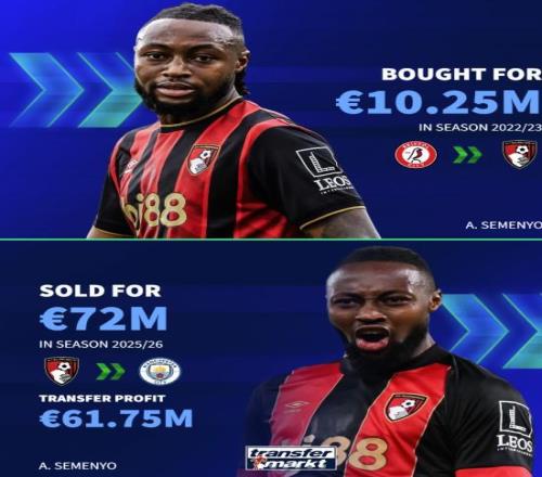 塞门约从伯恩茅斯转会加盟曼城的消息已得到官方确认,据悉转会费为7200万欧。据统计,塞门约超越索兰克,成为伯恩茅斯队史卖出最贵的球员。据德国转会市场网站统计,塞门约以7200万