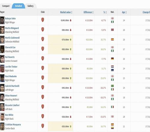 阿森纳球员身价变更:萨卡跌至1.4亿欧,厄德高下跌500万欧